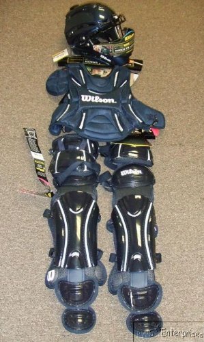 Wilson FP Gold Series Shock FX catchers hockey style helmet: * Model: Wilson A5570. * Color: Navy Blue. * Size: 6 1/8" - 7 1/8" S/M. * Floating Mask technology reduces vibration. * Quad-axial impact design diffuses energy of impact in four key zones. * Shock FX mask system absorbs up to 50% more impact than regular masks. * Premium leather chin liner. * Guaranteed paint job. Wilson FP Gold Series hinge FX chest protector: * Model: Wilson A3370. * Color: Two tone Navy Blue/Silver. * Size: 14". * Hinge FX design flexible body protection. * Special fastpitch pattern to prevent "riding up" when in ready stance. * Sewn through hinges for ultimate flexibility. * Air flow venting for temperature control and to reduce weight. * Memory foam reduces rebound. * All metal clips. Wilson FP Pro Edition hinge FX leg guards: * Model: Wilson A3570. * Color: Two tone Navy Blue/Silver. * Size: 14". * Dual hinge design conforms to legs. * Comfort system padding relieves pressure and adds protection. * Venting and molded foam design for added protection and reduced weight. * All metal clips. Check out all of our other auctions for more colors, styles and sizes!!!