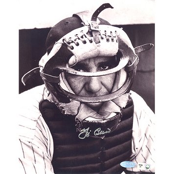 Yogi Berra Autographed w/ Catcher's Mask On Close Up Vertical B&W 8x10 Photograph Review